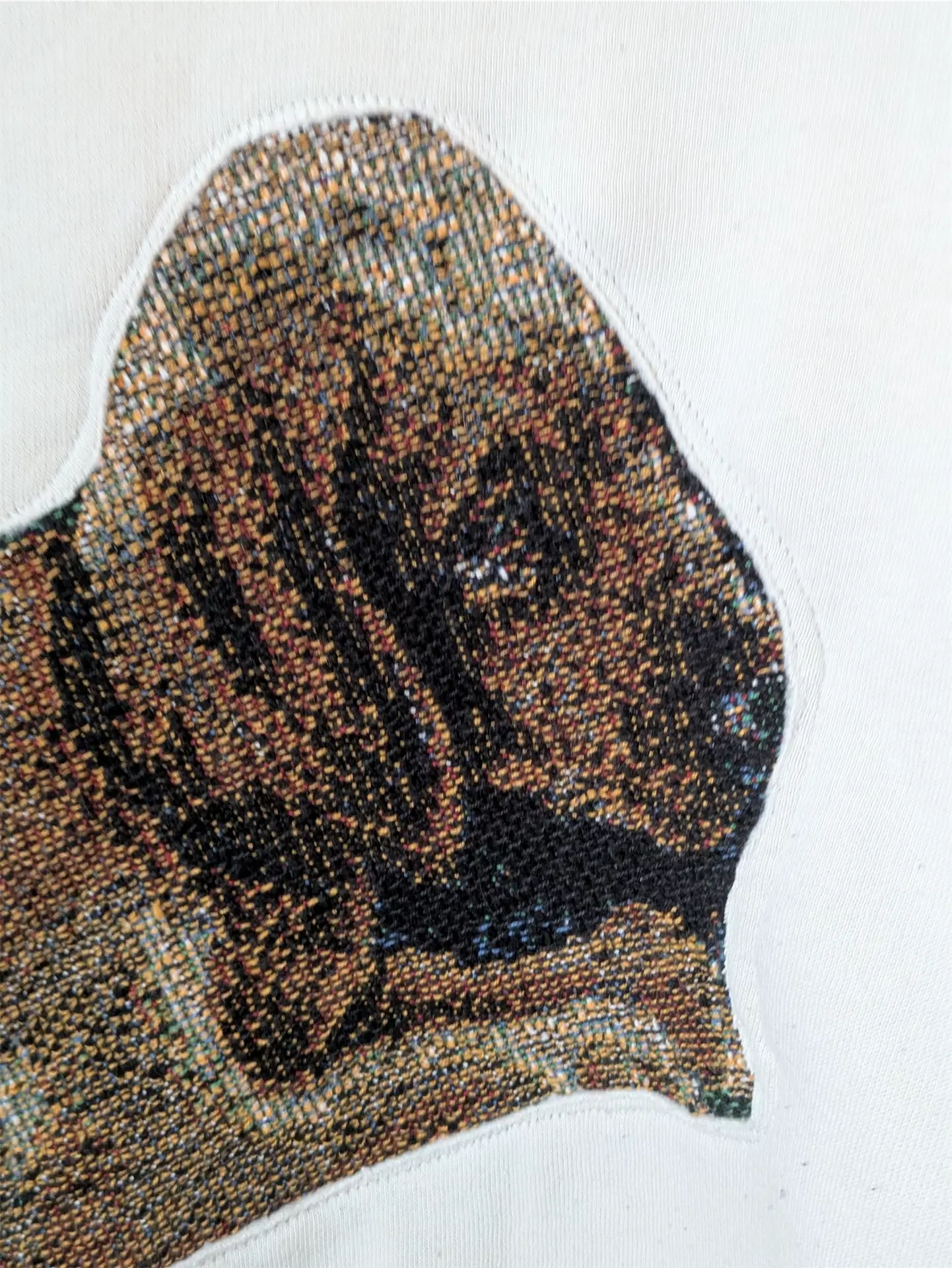 This one-of-a-kind street wear piece is uniquely adorned with the pup, bringing a super cute touch to your wardrobe and creating wearable art that makes a wonderful dog lover gift / pet lover gift / part of wonderful gifts for dog lovers. Perfect for those who love sustainable style (as well as dogs), this cottage core dog mom shirt combines comfort and creativity. Great for layering or as a statement piece, you'll not only look good but feel good knowing you're rocking upcycled clothing.