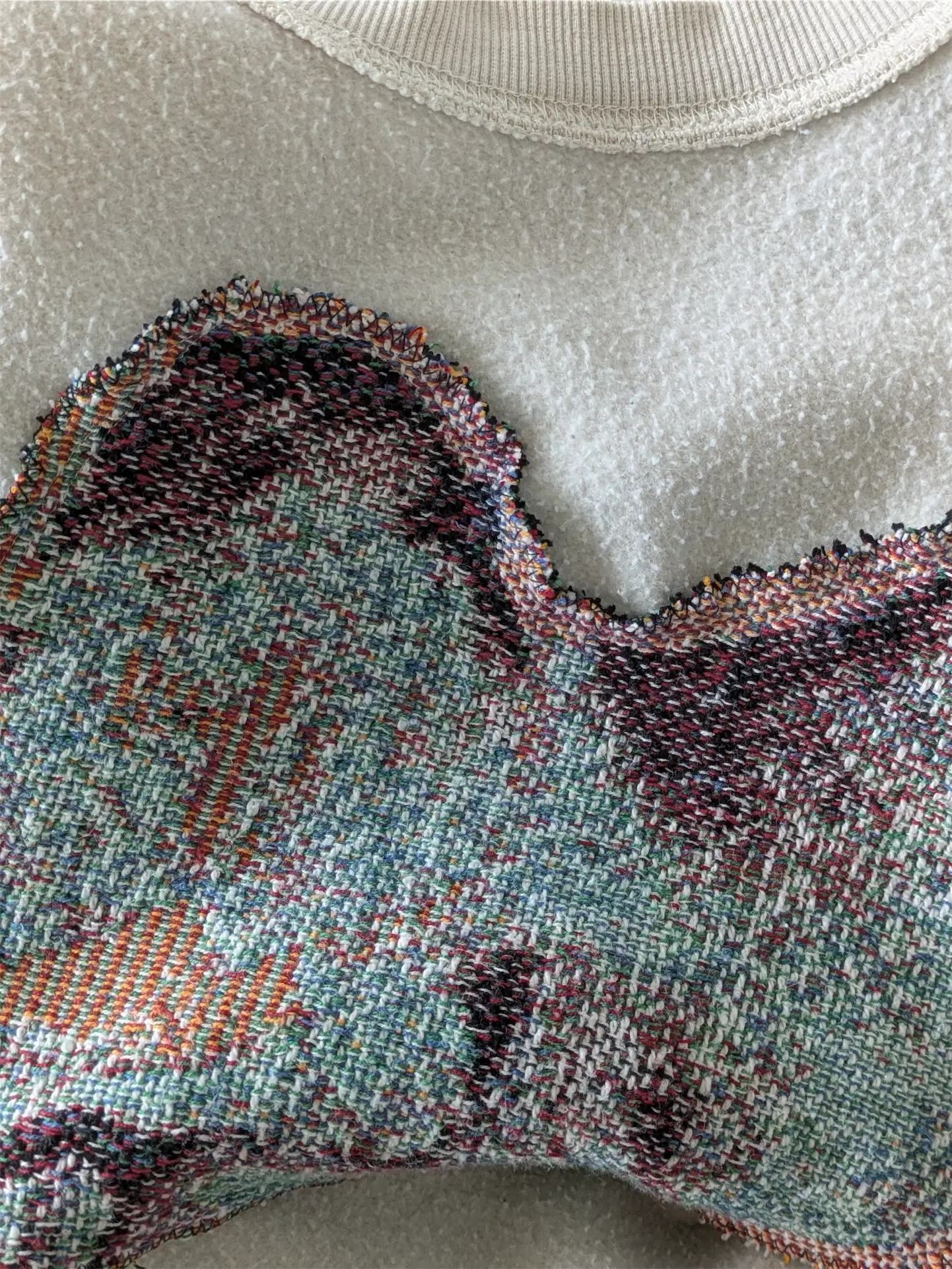 Looking for dog mom gifts? Search no more! Embrace eco-friendly fashion with our upcycled unisex cropped sweatshirt, featuring an adorable puppy from a reclaimed tapestry blanket.