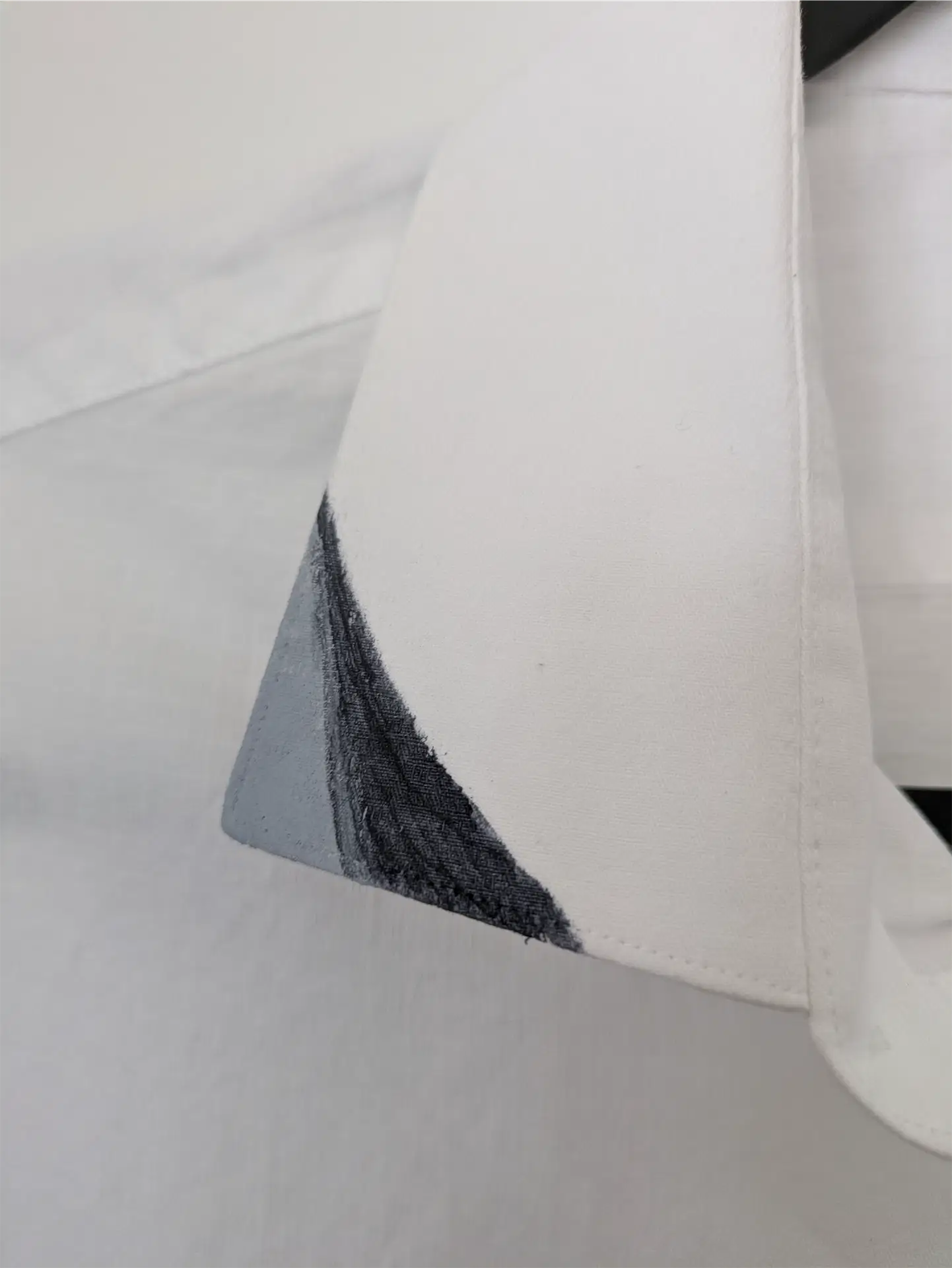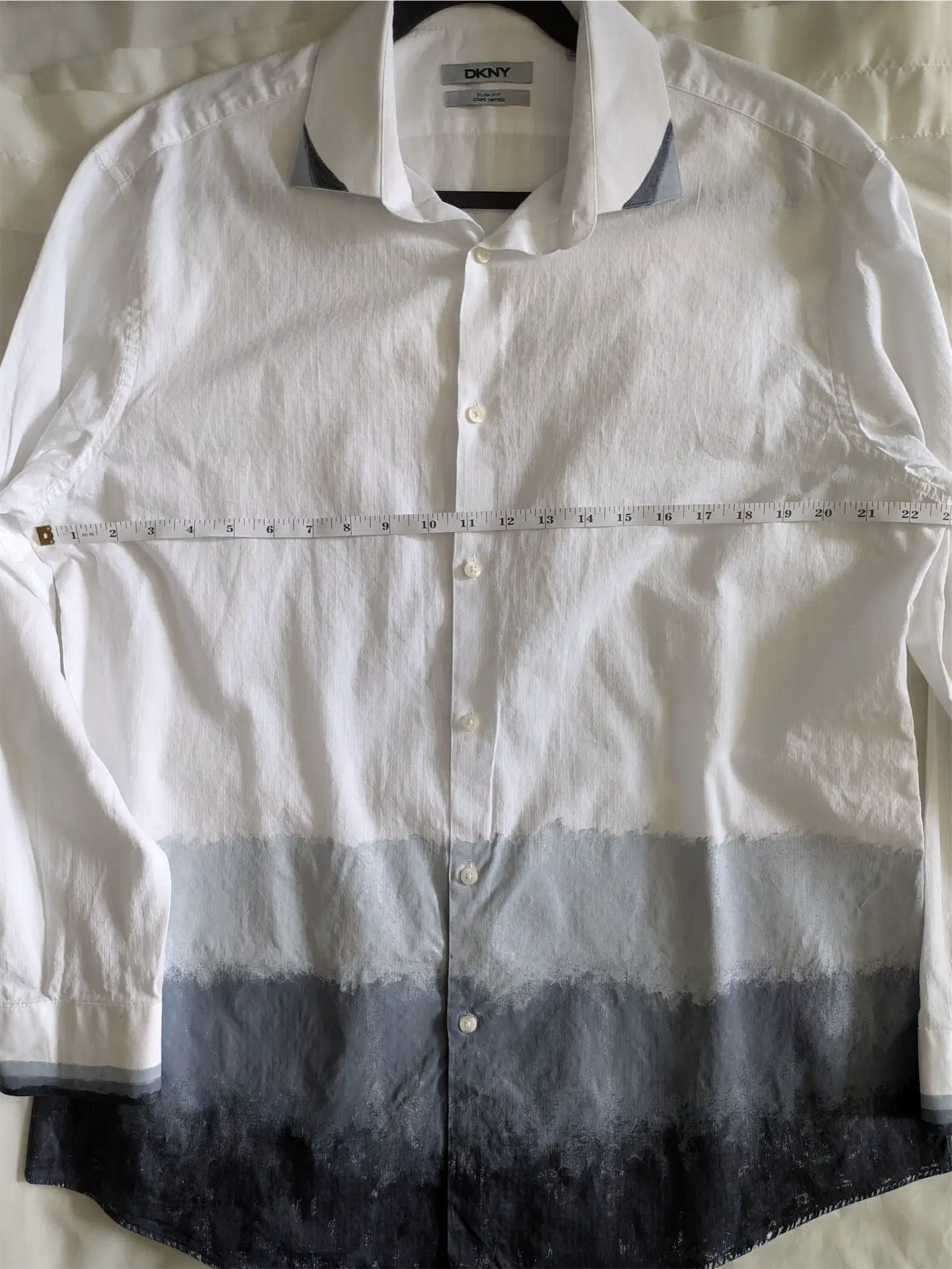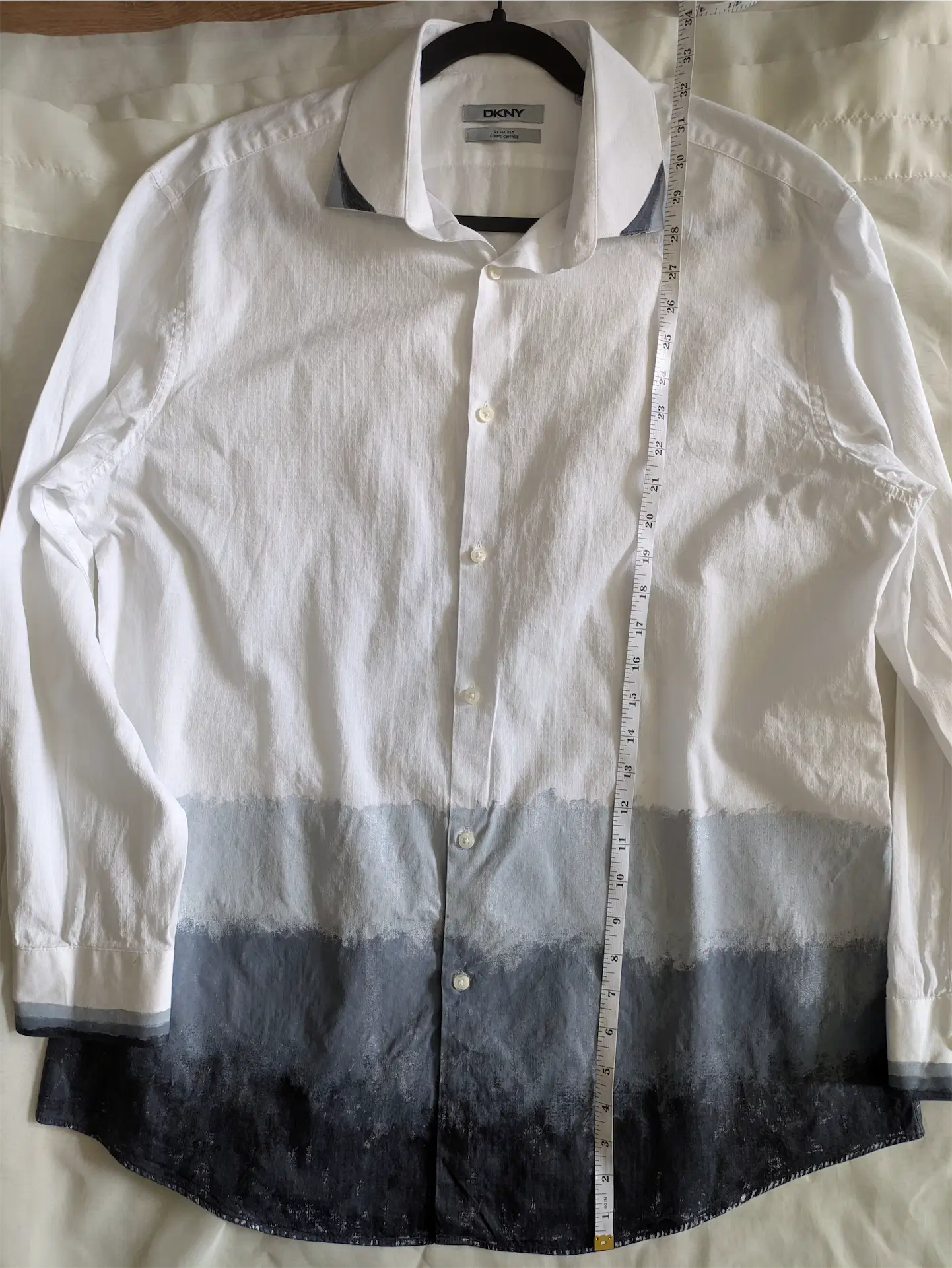 Meet your next go-to statement piece: a moody wearable art with timeless edge. This one-of-a-kind upcycled shirt dress / cotton blouse started life as a men’s slim-fit DKNY shirt, and has been reimagined into an effortlessly oversized fit that works beautifully as a blouse, tunic, or shirtdress. Think: cool, borrowed-from-the-boys vibes, but with a bold, artistic twist.