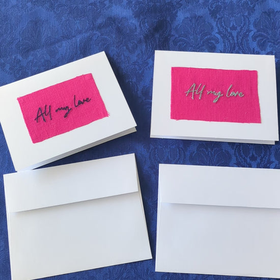 Looking for a special greeting card / thank you card / Christmas card / holiday card / anniversary card / birthday card to express love and gratitude over the holidays? How about some minimalist, retro Christmas vibe? These pretty handmade cards have been created with a pink cotton fabric, which has been embroidered with the words, "All my love". Show that you care with these special cards.