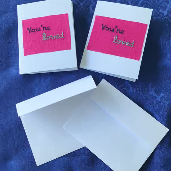 Looking for a special greeting card / thank you card / Christmas card / holiday card / anniversary card / birthday card to express love and gratitude over the holidays? How about some minimalist, retro Christmas vibe? These pretty handmade cards have been created with a pink cotton fabric, which has been embroidered with the words, "You're loved". Show that you care with these special cards.