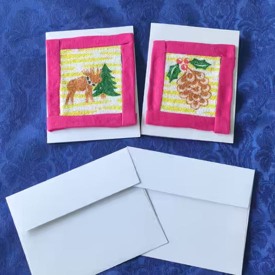 Looking for a special greeting card / thank you card / Christmas card / holiday card / birthday card to express love and gratitude over the holidays? How about some retro Christmas vibe? These pretty handmade cards have been created with a reclaimed holiday-themed cotton towel, which has been cut, framed in cute pink fabrics, then glued onto the craft paper. Give a gift of a cozy Christmas village scene with these special cards.