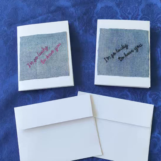 Looking for a special greeting card / thank you card / Christmas card / holiday card / anniversary card / birthday card to express love and gratitude over the holidays? How about some minimalist, retro Christmas vibe? These pretty handmade cards have been created with reclaimed denim scraps, which has been embroidered with the words, "I'm so lucky to have you". Show that you care with these special cards.