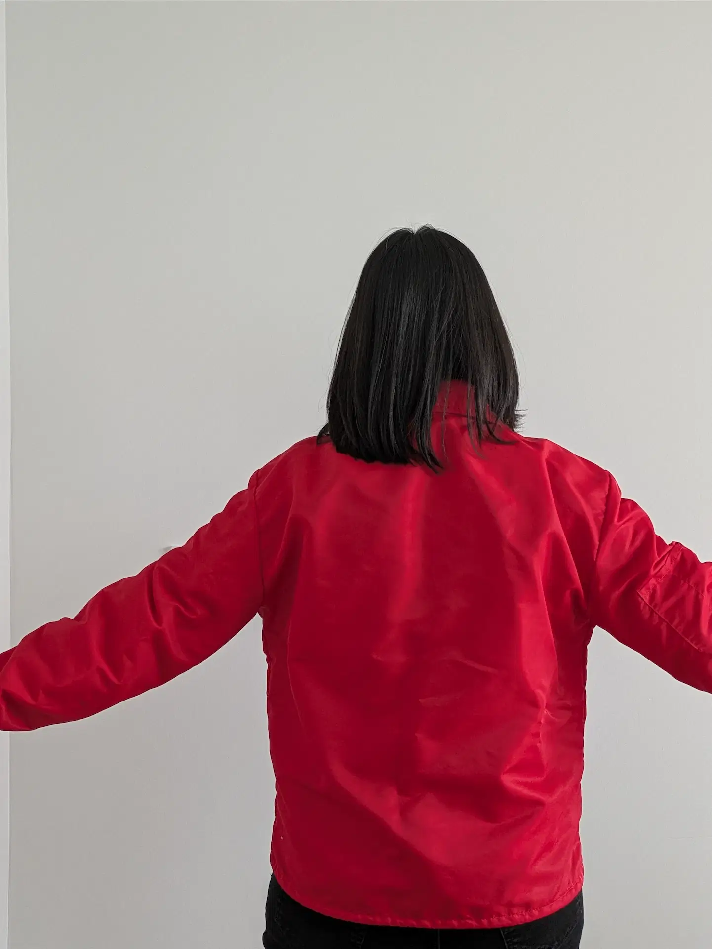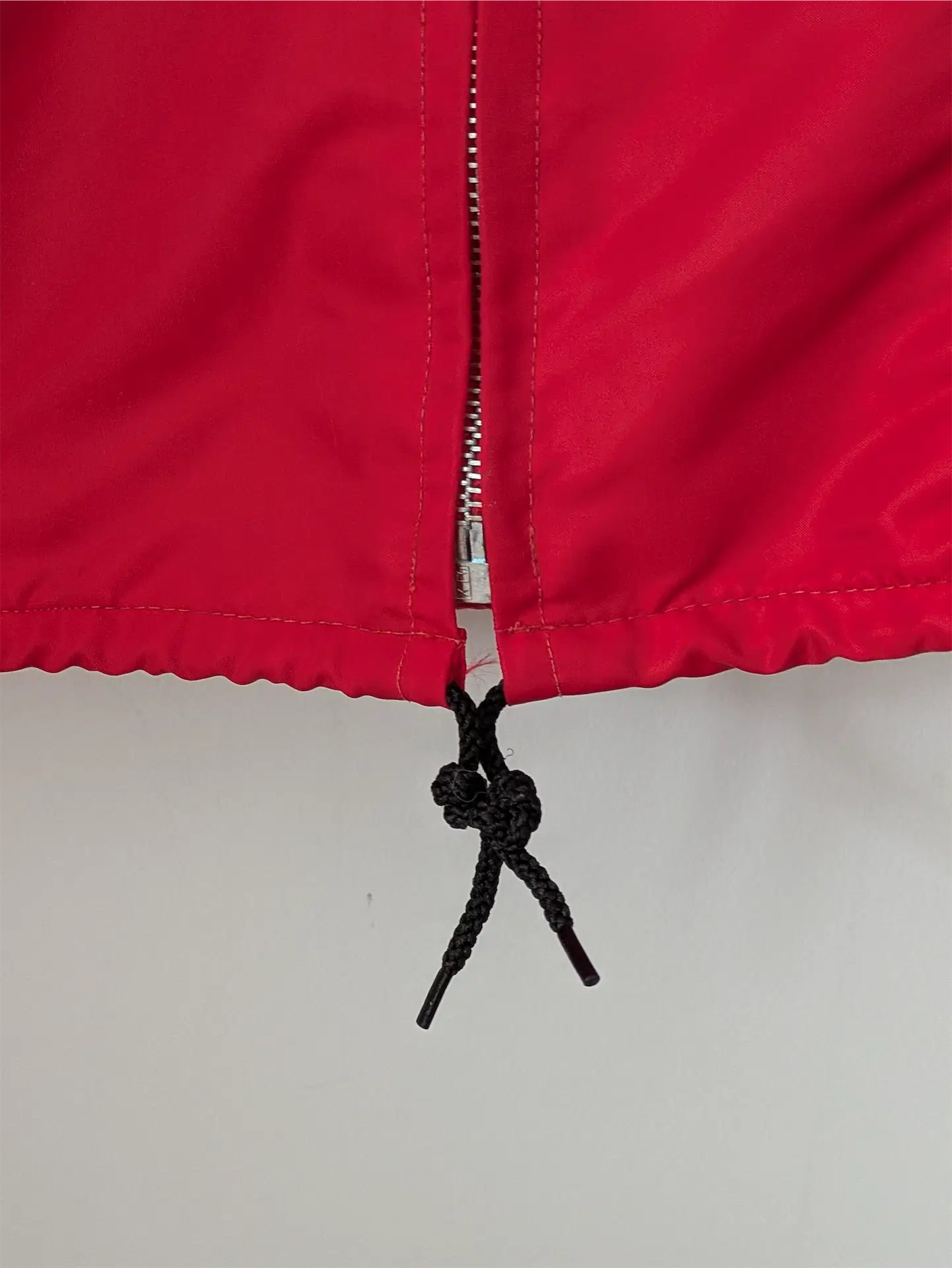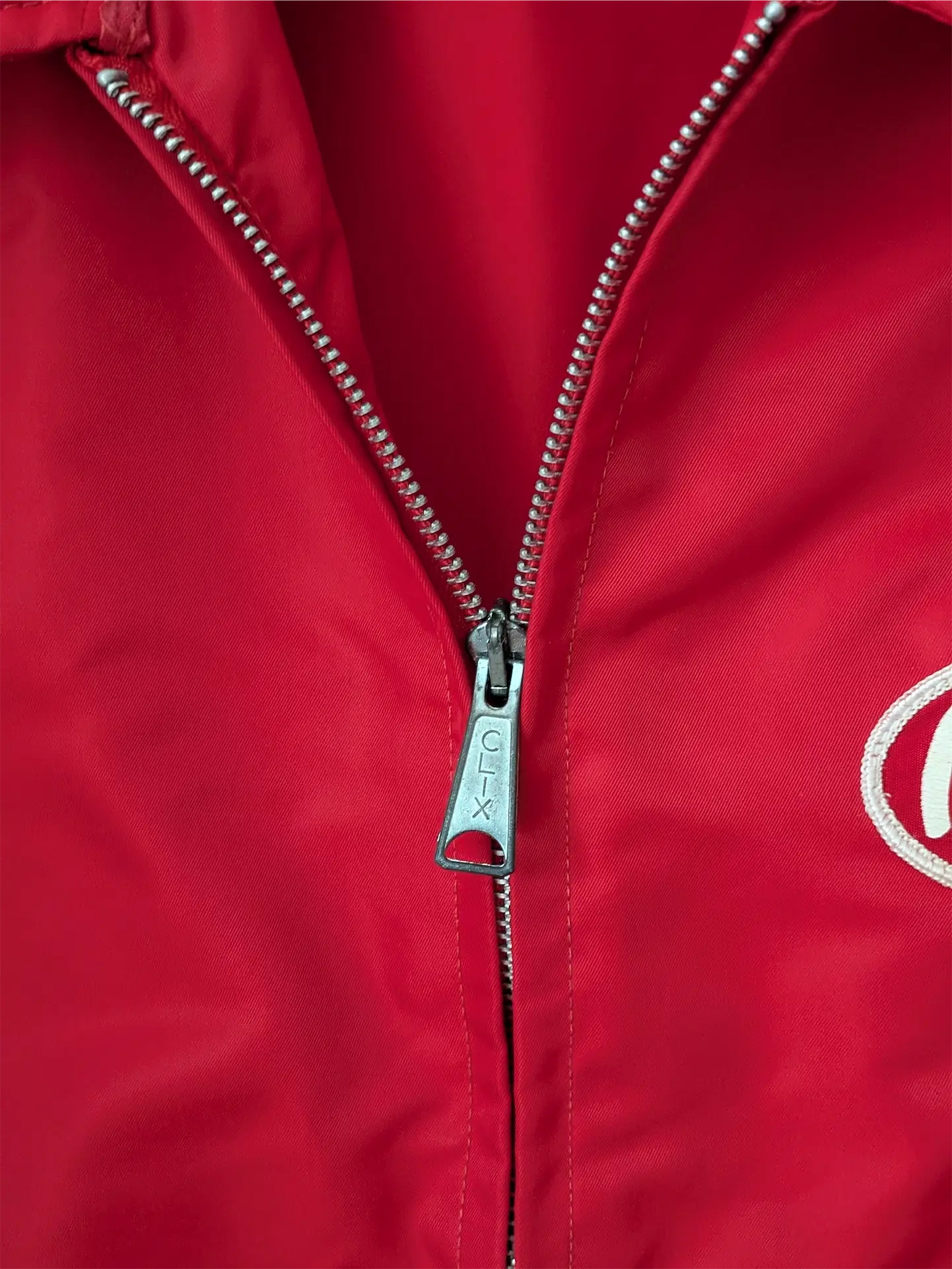 Channel your inner trucker with this extremely cool unisex, lightweight, nylon windbreaker. It's so fun with its red color, the retro "Peterbilt" logo, and white stripes! Based on the manufacturer label and the use of the CLIX zipper, this piece is assumed to be from the 1970s.