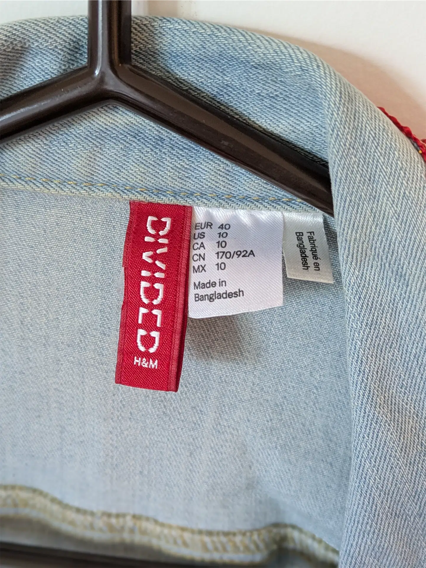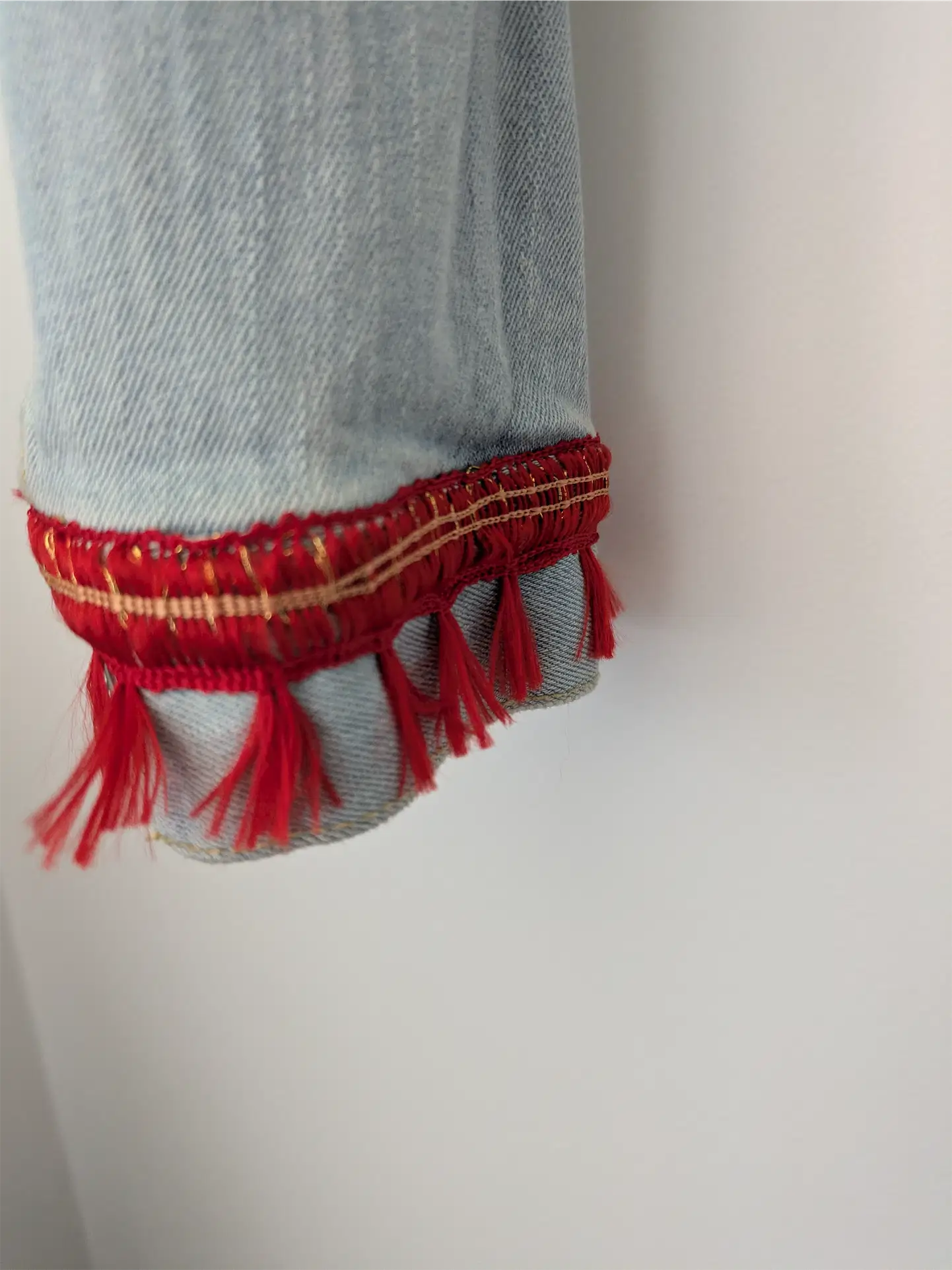 Calling all lovers of upcycled clothing, hippie clothes, and grunge clothing! This boho jean jacket is a one of a kind showstopper, reimagined with trims and embroidery from a reclaimed embroidered veil. The result? A denim jacket that’s part of fierce, fiery, and totally unforgettable street wear outfit. Add to your style by throwing it over a dress or pairing it with jeans. Or take it on adventure as part of your festival outfit or rave outfit! It's perfect as a fall or spring jacket.