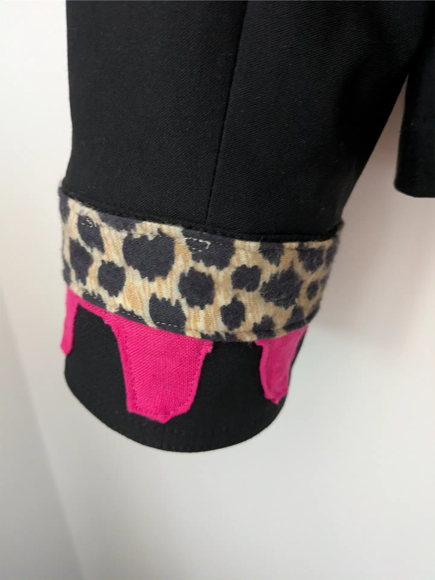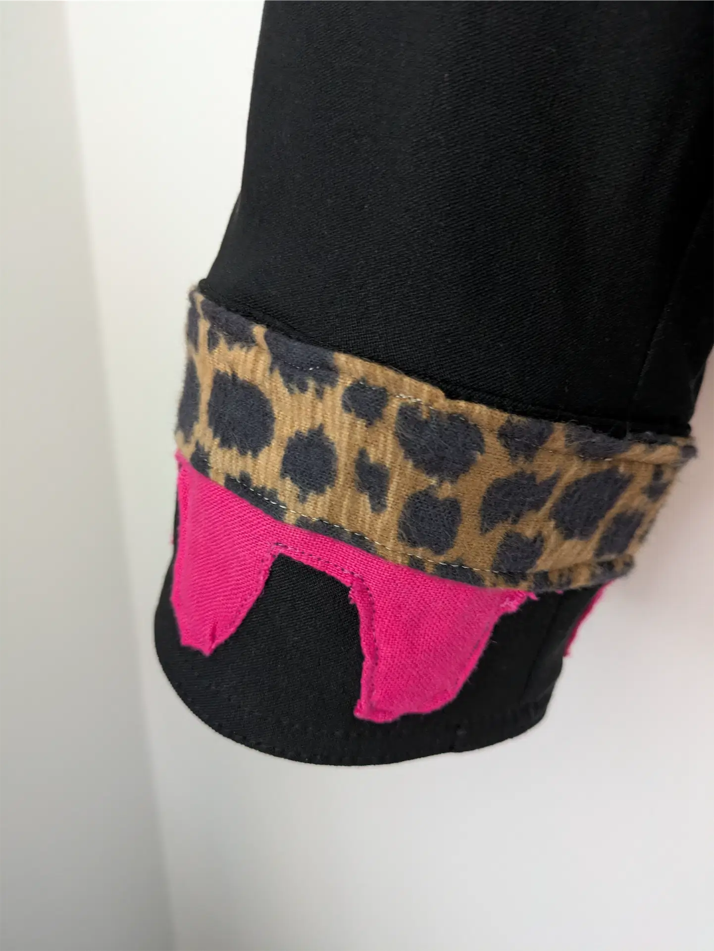 This upcycled vintage black bomber jacket is a total showstopper, perfect as rave outfit, concert outfit, or festival outfit. Fiercely reworked with reclaimed fabrics featuring leopard illustrations, leopard print, and bold hot pink appliqué. The result? A jacket that’s equal parts punk, playful, and powerful. We’ve added statement details on the back, collar, and sleeves, giving it that “all eyes on you” vibe from every angle of this 90s jacket. And here’s the kicker—it’s intentionally sewn to look rough around the edges, with jaggy stitches and punk-inspired finishing for that perfectly imperfect street-style edge.